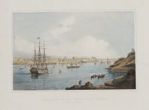 (MENORCA) - 1860 ca - FONT, JUAN [dibujo] ; VALLEJO, J. [litografió] : VISTA DE UNA PARTE DEL PUERTO, Y CIUDAD DE MAHÓN, TOMADA DE LA LAJA DE SAN ANTONIO. Madrid : litografía de J. Donón, [c. 1860]. 36 x 48 cm. En hoja de 44 x 58 cm.