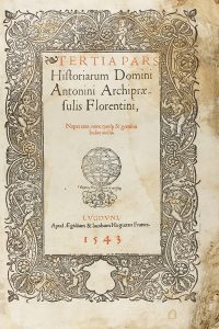 (HISTORIA) - 1543 - ANTONIO DE FLORENCIA : TERTIA PARS HISTORIARUM DOMINI ANTONINI ARCHIPRAESULIS FLORENTINI. Lugduni (Lyon) : Apud Aegidium & Iacobum Huguetan Fratres, 1543. 4º mayor. 14 h. + CCXII folios numerados, 1 h.