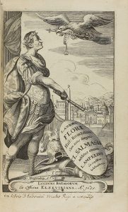 Grabado en portada de G. Wingendorp, en el que Julio César laureado recibe del pico de un águila una flecha con la corona, a los pies las armas de sus vencidos.