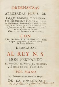 ERIGIR EN LA CIUDAD DE OVIEDO, CAPITAL DEL PRINCIPADO DE ASTURIAS. CON UNA NARRACIÓN HISTORIAL DEL ORIGEN, PROGRESOS, Y ESTADO ACTUAL DE DICHO HOSPICIO. DEDICADAS AL REY N. S. DON FERNANDO [. . . ] POR MANO DEL EXC. SEÑOR MARQUES DE LA ENSENADA. [SIGUE : ] ORDENANZAS QUE SE DEBEN OBSERVAR EN EL GOVIERNO, ADMINISTRACIÓN, POLICIA Y ECONOMIA DEL HOSPICIO GENERAL DEL PRINCIPADO DE ASTURIAS, Y HOSPITAL REAL DE EXPOSITOS [. . . ].