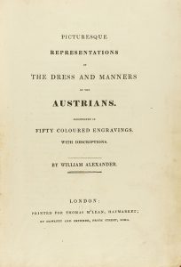 (AUSTRIA) - 1810 ca - ALEXANDER, WILLIAM : PICTURESQUE REPRESENTATIONS OF THE DRESS AND MANNERS OF THE AUSTRIANS. London : printed for Thomas M´Lean, Haymarket, s. a. 1810 ca. 4º menor. XV + 45 láms. a color (de 50) con otras tantas hojas...