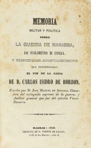 (HISTORIA) - 1840 - ARIZAGA, JOSE MANUEL DE : MEMORIA MILITAR Y POLÍTICA SOBRE LA GUERRA DE NAVARRA, LOS FUSILAMIENTOS DE ESTELLA, Y PRINCIPALES ACONTECIMIENTOS QUE DETERMINARON EL FIN DE LA CAUSA DE D. CARLOS ISIDRO DE BORBON. Madrid : Imp. D....