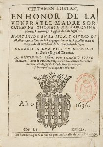 (MALLORCA) - 1636 - THOMAS, MIGUEL [editor] : CERTAMEN POÉTICO EN HONOR DE LA VENERABLE MADRE SOR CATHARINA THOMASA MALLORQUINA, MONJA CANÓNIGA REGLAR DE SAN AGUSTÍN. MANTENIDO EN LA ISLA, Y CIUDAD DE MALLORCA, EN LA SALA DE LA CONGREGACIÓN DE...