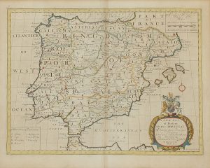 (ESPAÑA-Portugal) - 1700 ca. - SPOFFORTH, R. : A NEW MAP OF PRESENT SPAIN & PORTUGAL. Showing their principal divisions. Mapa grabado al cobre, plancha 37 x 50 cm, papel 44 x 55 cm. Límites y cartela coloreados.