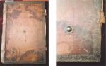 Decoración de hilos a tres tintas de estilo y anchos de color. Encuadernación original de madera forrada de piel, con périda en el lomo que muestra los cuatro nervios cosidos.