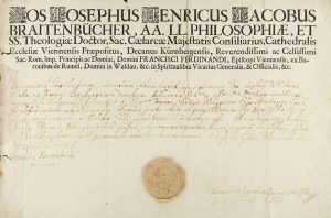 (VIENA-BARCELONA) - 1714. DIPLOMA CONCEDIDO A CARLES DE VILLANA DE LA DIÓCESIS DE BARCELONA. 1714, abril. Viena. Por Joseph Henricus Iacobus Braitenbücher, doctor en Philosophia et SS. Teologia, preposito de la cathedral de Viena.