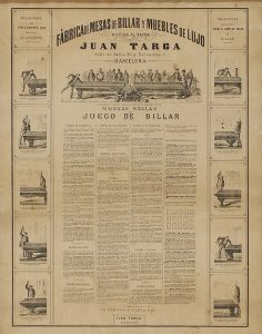 (BILLAR) - 1860 ca. - FABRICA DE MESAS DE BILLAR Y MUEBLES DE LUJO MOVIDA AL VAPOR DE JUAN TARGA. Cartel, 62 x 48 cm.