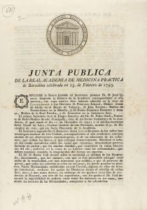 JUNTA PUBLICA DE LA REAL ACADEMIA DE MEDICINA PRACTICA DE BARCELONA CELEBRADA EN 14 DE MARZO DEL AÑO 1791.