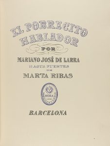 (BIBLIOFILIA) - 1945 - LARRA, MARIANO JOSÉ DE : EL POBRECITO HABLADOR. 11 AGUAFUERTES DE MARTA RIBAS. Barcelona : Montaner y Simón, 1945. 4º. 210 p. , 4 h. Cabeceras y colofones grabados en madera por Enric Tormo.