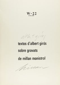 (BIBLIOFILIA) - 1978 - GIROS, ALBERT [textos] ; MONISTROL, MILLAN [grabados] : DEPREDADORS. Lloret de Mar : taller w-22, 1978. Folio. 11 pliegos en rama.