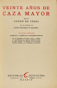 (CAZA). - 1948. - YEBES, CONDE DE : VEINTE AÑOS DE CAZA MAYOR. Con un prólogo de José Ortega y Gasset. Madrid : Ed. Plus Ultra, 1948. 8º. 507 p. , 2 h. Ilustr. en el texto (89 fotografías y 92 dibujos), 1 mapa venatorio de España...