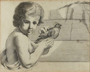 S. XIX. GRABADO DE UN NIÑO CON AVE DE CORRAL. 15 X 18,5 cm.