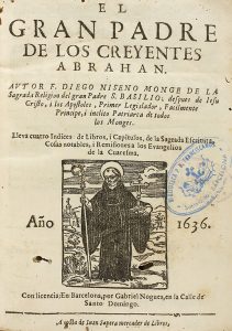 (RELIGION) - 1636 - NISENO, DIEGO : EL GRAN PADRE DE LOS CREYENDES ABRAHAN. Barcelona : Gabriel Nogues, 1636. 8º. 8 h. + 266 p. + 18 h. Cabecersa y culs-de-lampe.