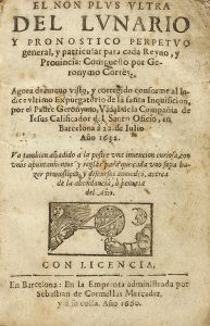 (HUMANIDADES) - 1660 - CORTES, GERONYMO : EL NON PLUS ULTRA DEL LUNARIO Y PRONOSTICO PREPETUO GENERAL. . . Barcelona : Sebastian de Comellas, 1660. 8º menor. 216 p. + 5 h.