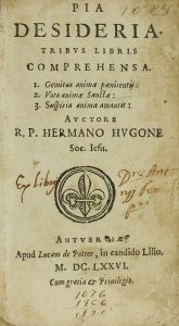 (RELIGIÓN) - 1676 - HUGONE, R. P. HERMANO [HERMAN HUGO] : PIA DESIDERIA. TRIBUS LIBRIS COMPREHENSA. Antuerpiae [Antwerp] : Lucam de Potter, 1676. 12º. 8 h. + 416 p.