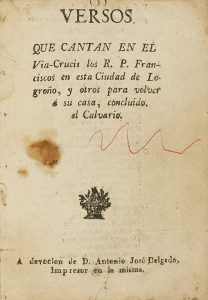 S. XVII. (LOGROÑO-RELIGION) - VERSOS QUE CANTAN EN EL VIA-CRUCIS LOS R-P. FRANCISCOS EN ESTA CIUDAD DE LOGROÑO Y OTROS PARA VOLVER A SU CASA, CONCLUIDO EL CALVARIO. A devocion de D. Antonio José Delgado, imp. en la misma. 8º menor. 15 p....