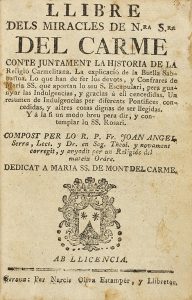 (RELIGIÓN) - 1700 ca - SERRA, JOAN ANGEL : LLIBRE DELS MIRACLES DE Nra. Sra. DEL CARME. Gerona : Narcis Oliva Estamp. , 1700 s. a. (fecha extraída de la aprobación). 8º menor. 352 p. Enc. en pasta española, rozada.
