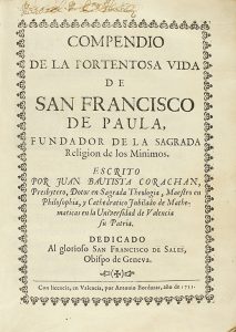 (HAGIOGRAFÍA) - 1733 - CORACHAN, JUAN BAUTISTA : COMPENDIO DE LA PORTENTOSA VIDA DE SAN FRANCISCO DE PAULA. . . Valencia : Antonio Bordázar, 1733. 4º. 12 h. , 230 p. Cabeceras, capitales y ´culs-de-lampe´. Pergamino de la época.