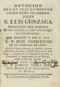 (RELIGION) -1750 ca - CAPELLUCHI, JUAN : DEVOCION DE LOS SEIS DOMINGOS A MAYOR GLORIA DEL ANGELICO JOVEN S. LUIS GONZAGA PROPUESTO POR MODELO DE UNA EXEMPLAR, Y SANTA VIDA EN ALGUNAS CONSIDERACIONES. Mallorca : Imp. Salvador Savall, s. a. 8º...