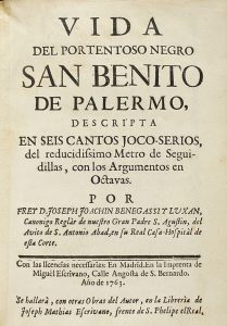 (HAGIOGRAFÍA) - 1763 - BENEGASSI Y LUXAN, JOACHIN : VIDA DEL PORTENTOSO NEGRO SAN BENITO DE PALERMO, DESCRITA EN SEIS CANTOS JOCO-SERIOS. . . Madrid : Imp. Miguel Escrivano, 1763. 8º mayor. 10 h. + 181 p. , 1 h.