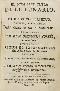 (HUMANIDADES) 1768 - CORTES, GERÓNYMO : EL NON PLUS ULTRA DE EL LUNARIO, Y PRONOSTICO PERPETUO, GENERAL, Y PARTICULAR. . . Barcelona : Imp. Maria Angela Martí viuda, 1768. 3 h. + 312 p. Enc. en pergamino.