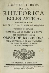 (RELIGIÓN) - 1780 ca - GRANADA, FRAY LUIS DE : LOS SEIS LIBROS DE LA RHETORICA ECLESIASTICA. Barcelona : Imp. Juan Jolis, s. a. 4º menor. 576 p. Enc. pergamino de época con el lomo restaurado. Cantos jaspeados.