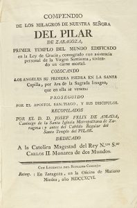 (HAGIOGRAFÍA) - 1796 - AMADA, JOSEF FELIX DE : COMPENDIO DE LOS MILAGROS DE NUESTRA SEÑORA DEL PILAR DE ZARAGOZA. Zaragoza : Imp. Mariano Miedes, 1796. 8º mayor. 20 h. + 297 p. + 10 h.