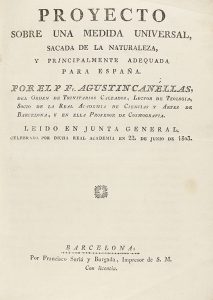 (CIENCIAS) - 1800 ca - CANELLAS, AGUSTIN : PROYECTO SOBRE UNA MEDIDA UNIVERSAL SACADA DE LA NATURALEZA, Y PRINCIPALMENTE ADEQUADA PARA ESPAÑA. Barcelona : Francisco Suriá y Burgada, imp. , s. a. 8º mayor. 31 p. , 1 lám. Rústica.