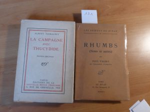 VALERY (Paul) : Rhumbs (Notes et autres). Paris, Le Divan, 1926 ; in-12°, broché, couv. imp. Ed. original, un des 100 ex. num. sur Rives. THIBAUDET (Albert) : La Campagne avec Thucydide. Paris, NRF, 1922 ; in-12, broché. Ed. original.