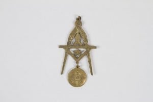 Joli bijou maçonnique avec les outils symboliques et l’étoile flamboyante en pendant. XIXe siècle. 8,5 cm