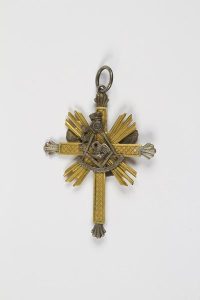 Bijou de Chevalier Rose-croix en argent et vermeil. Croix latine rayonnante biface, l’avers avec le bijou du grade, compas couronné avec le pélican à la rose et au revers l’aigle. Fin du XVIIIe - début du XIXe siècle. 8,5 cm Poids : 31 g