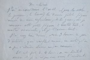 " Ma Chérie, j'ai encore dans l'œil (pas le sale, le propre, le bon), la douce petite figure aimée de mon enfanlou, à la gare, et je conserve cette petite figure à moitié triste, à moitié souriante, et je l'aime tant. J'ai assez bien dormi avec 3 hommes de peu d'intérêt qui ronflent encore […]. Il est prêt de 4 heures, on va bientôt arriver et je n'ai pas vu venir l'accident. Je tacherai, en arrivant à l'Hôtel de France de redormir encore quelques heures, comme quand on arrive un matin chez la Mémé, seulement il n'y aura pas la Mémé, ni du nez, ni du bras. Heureusement que je vais retrouver tout ça dans 4 jours. Je t'aime de toute mon âme ".