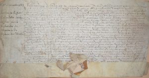 YONNE. Parchemin daté du 10 décembre 1513, avec reste de sceau pendant en cire jaune. Nomination par Tristan de Salazar, archevêque de Sens, de Pierre Gouvray à la cure de Landelin.