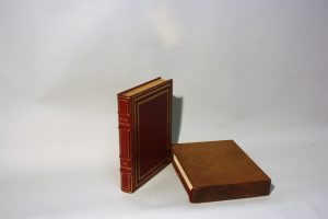 Gardes doublées du même tissu, tête dorée, non rogné, couverture et dos conservés, étui de luxe bordé de peau.