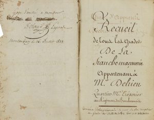 complets avec : la Décoration, les Préambules et Préalables, Ouvertures, Réceptions, Instructions, Fermetures, Travaux de banquet. Ils sont ornés de plusieurs dessins dont la pierre cubique de l’écossais, l’échelle, les tables hiéroglyphiques. La page de garde précise que ce recueil appartenant à Mr Delrieu, Quartier Maître Trésorier au Régiment de Bourbonnais qui l’a ensuite offert à Olivier Laprade le jour de sa réception de Souverain Prince Rose-Croix à Montauban le 16 juillet 1833.