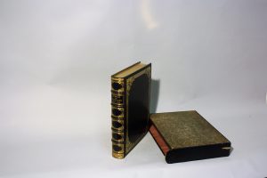 Chemise en demi - maroquin à rabats, dos décoré de caissons et du titre dorés, étui de luxe bordure peau.