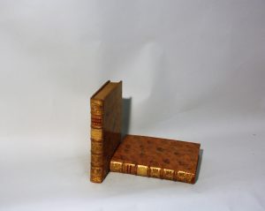 Dos à 5 nerfs cloisonnés et fleuronnés portant les pièces de titre en maroquin rouge et les pièces de tomaison en maroquin vert pâle, roulette dorée sur les coupes, tranches jaspées.