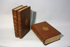 Dos à 6 nerfs ornés de fleurons dorés et portant les titres dorés, filet doré d'encadrement sur les plats qui présentent de grandes armes dorées, tranches jaspées.