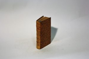 Dos à 5 nerfs cloisonné et fleuronné portant une pièce de titre en maroquin rouge, roulette dorée sur les coupes, tranches jaspées.