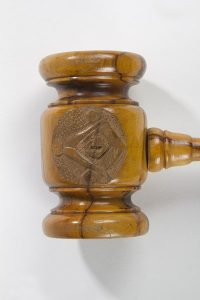 Maillet en bois d’olivier, la tête est gravée des symboles maçonniques : compas-équerre et le « G ». 24 cm