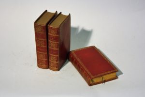 Dos lisses très ornés et dorés portant les titres dorés, dentelle d'encadrement dorée sur les plats, roulette dorée sur les coupes et sur les chasses, tranches dorées.