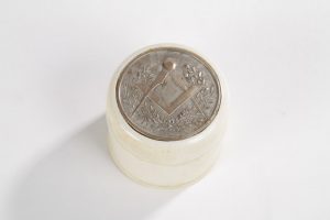 Boîte circulaire en ivoire à décor maçonnique. XIXe siècle. H. : 4,5 cm – D. : 4,5 cm