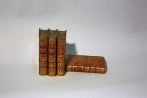 Dos à 5 nerfs cloisonnés et fleuronnés portant les pièces de titre et de tomaison en maroquin rouge pour les trois premiers et havane pour le dernier, tranches jaspées de bleu.