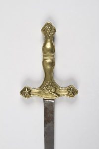 Glaive maçonnique à décor de Chevalier Rose-Croix, poignée en bronze sculptée des symboles : crane, quillons, Pélican, étoiles, rose et delta rayonnant. Milieu du XIXe siècle. L : 94 cm