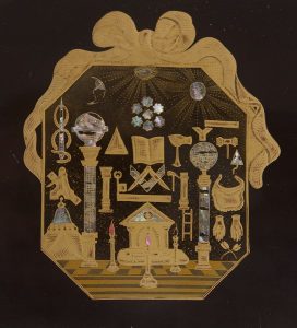 Boîte en laque noire du Japon de forme rectangulaire. Son couvercle est orné d’un tableau de loge composé de nacre irisée et laque dorée : Temple, chandeliers, colonnes, globes, tablier, compas-équerre, plumes, échelles, maillet, ciseau,...