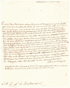 ► Très belle lettre du Duc de Villequier, en qualité de 1er Gentilhomme de la Chambre, adressant la Croix de St-Louis au Marquis de BEAUHARNAIS, pour ses services en émigration. Je reçois dans la minute même (…) une grâce du Roi qui m’est très sensible, c’est l’ordre de vous recevoir chevalier de St-Louis. Je m’imagine que vous en aurés reçû aussi la lettre d’avis (…).