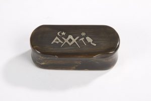Tabatière en corne, le couvercle est incrusté de motifs maçonniques en argent : niveau, compas-équerre, maillet, truelle, soleil, lune. XIXe siècle. 6 x 3 x 2 cm