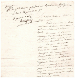Le Général Bonaparte, qui est en train de signer la Paix de Leoben avec les Autrichiens, à signé « Bo » sous le mot « accordé » écrit de la main de son secrétaire, Bourrienne, et « Bonaparte » en entier sous la note :