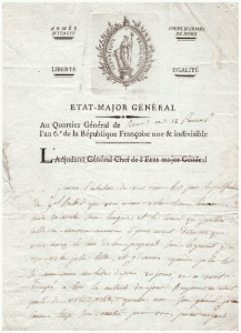 le petit théâtre à Milan. Au Q.G. de Rome, ce 12 Prairial an 6e (31 mai 1798). 3 pp. bi-feuillet in-4, en-tête de « l’Adjudant-Général chef de l’État-Major général » de l’Armée d’Italie, avec vignette ovale italienne, adresse au verso ; petite déchirure suite à l’ouverture de la missive.