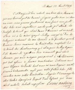 Louis-Antoine de France Duc d’ANGOULÊME. 1775-1844. Fils du Comte d’Artois futur Charles X. Lettre autographe signée à sa mère Marie-Thérèse de SAVOIE. Mittau, 13 avril 1799. 1 pp. in-4.